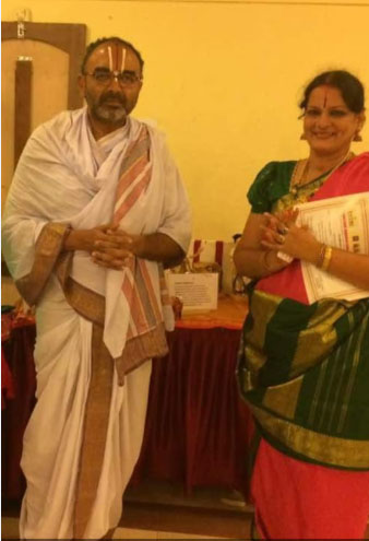 Vedantam Swamy of SPVST Sabha felicitating CHITRA RAMAN on her creation of DESIKAR VAIBHAVAM