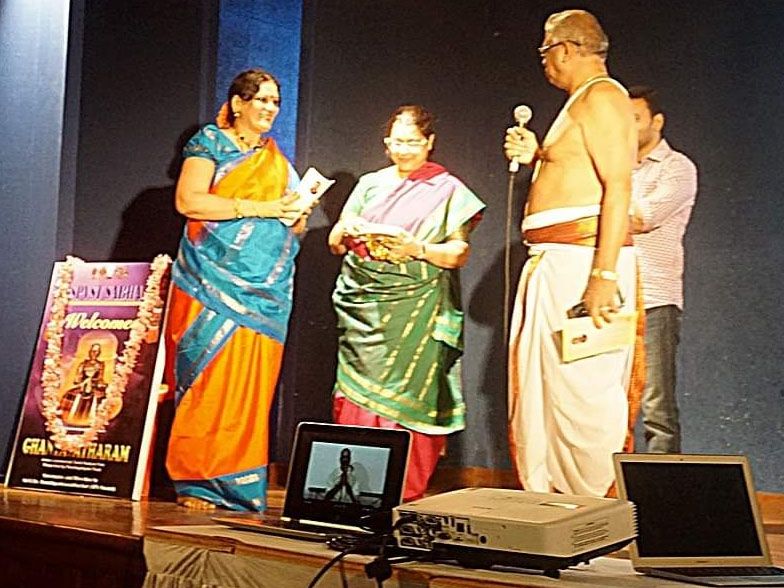 Vedantam Swamy of SPVST Sabha felicitating CHITRA RAMAN on her creation of DESIKAR VAIBHAVAM